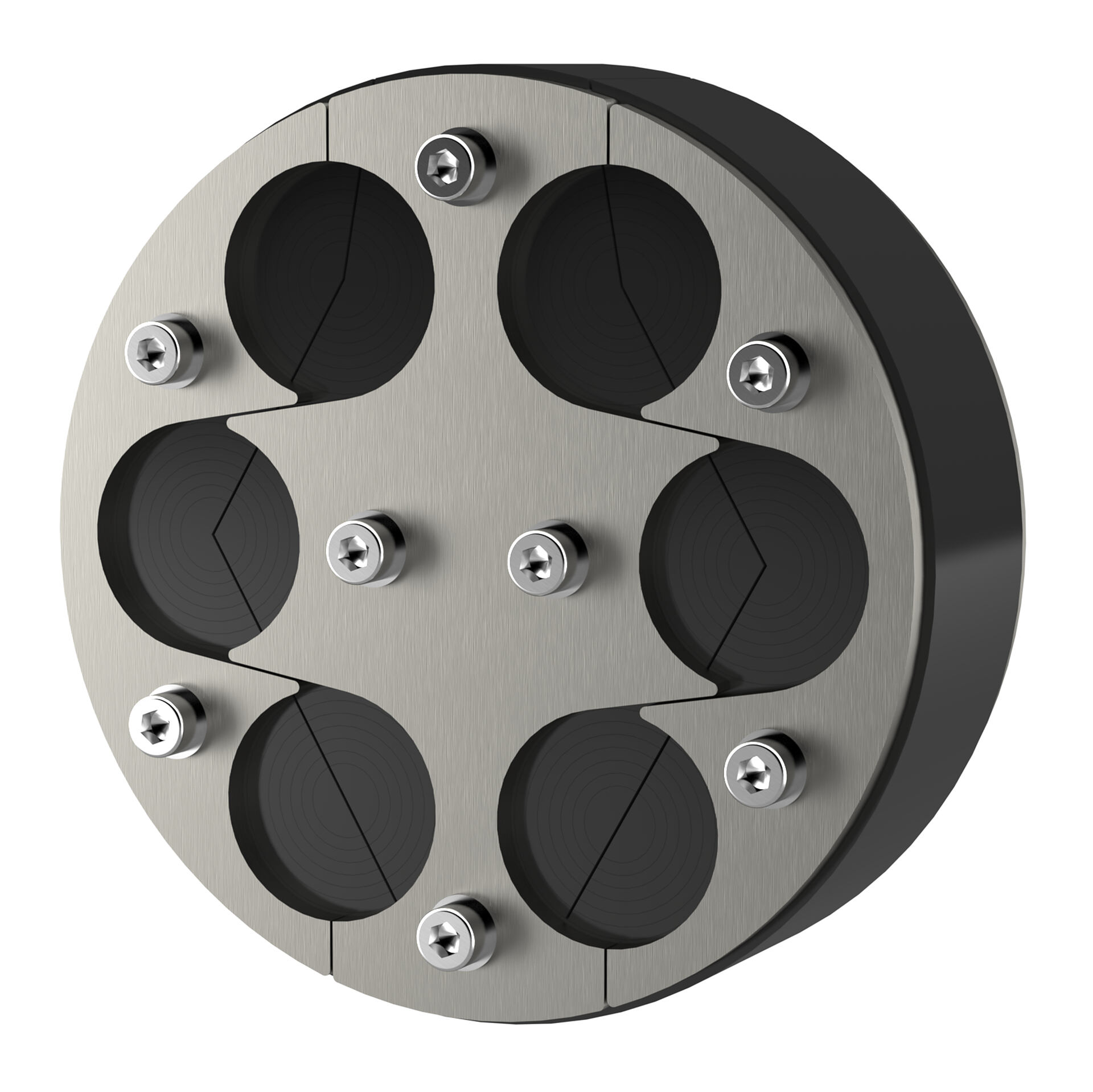 Gumowy wkład uszczelniający do zamontowania w przewiercie lub rurze przepustowej litej o średnicy 150mm, umożliwiający uszczelnienie 6 kabli o średnicy 8-35mm. Wersja dzielona. Wykonanie materiałowe: V2A/EPDM. W zestawie korki do zaślepienia niewykorzystanych otworów. Karta katalogowa do pobrania