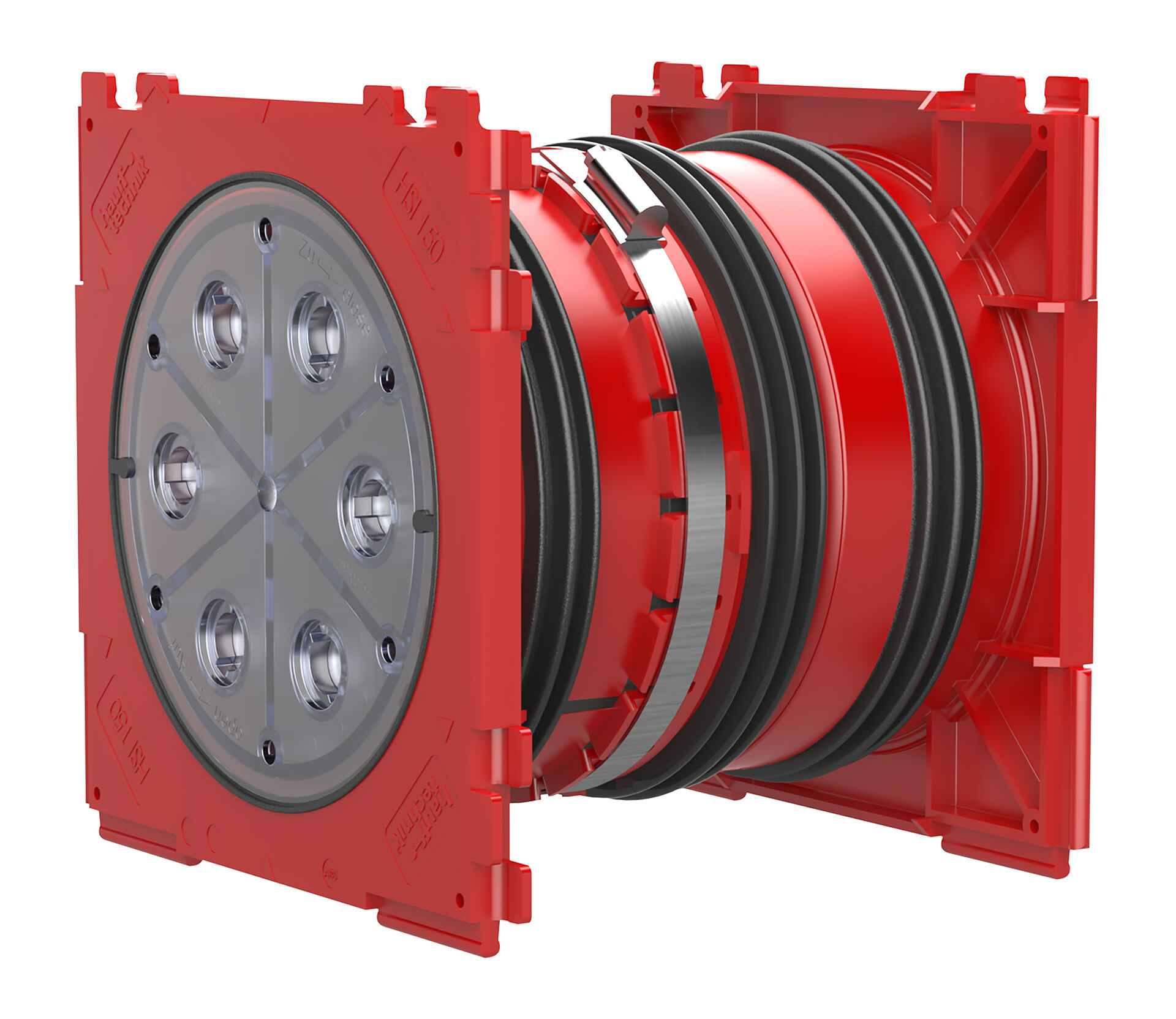 Dwustronny przepust kablowy HSI150 przeznaczony do zabetonowania w ścianie o grubości 470-575mm.